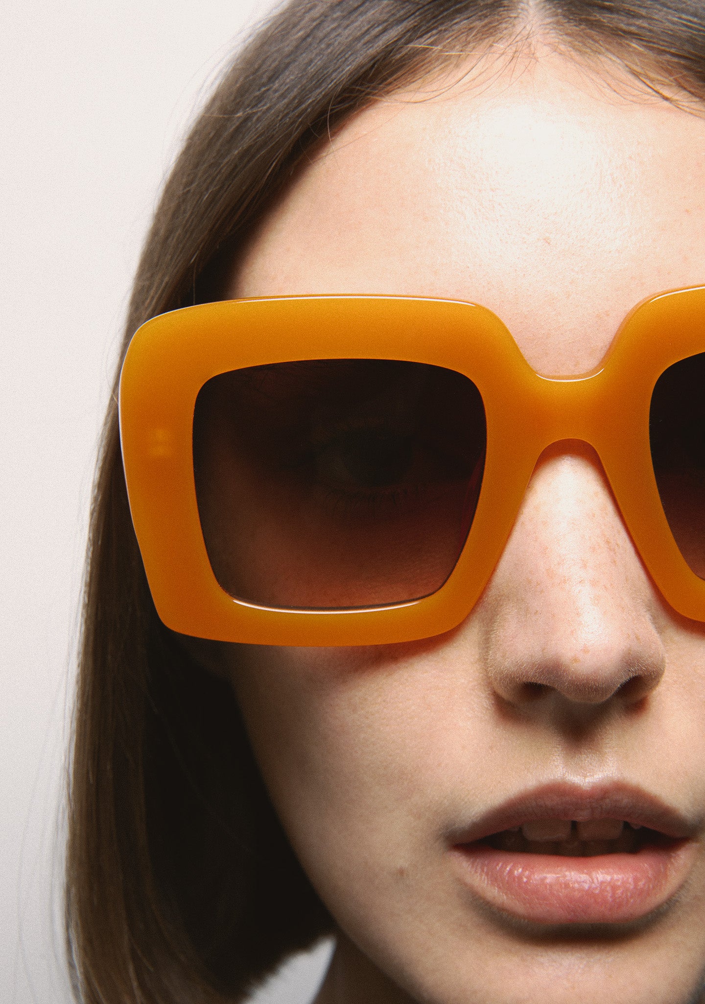 Gafa de sol de forma cuadrada oversize. Frontal y varillas de acetato naranja. Lente marrón degrada base 2 con 100% protección UV y tratamiento antirreflejante. Lente Categoría 3. Plaquetas de acetato incorporadas. Hecha a mano.