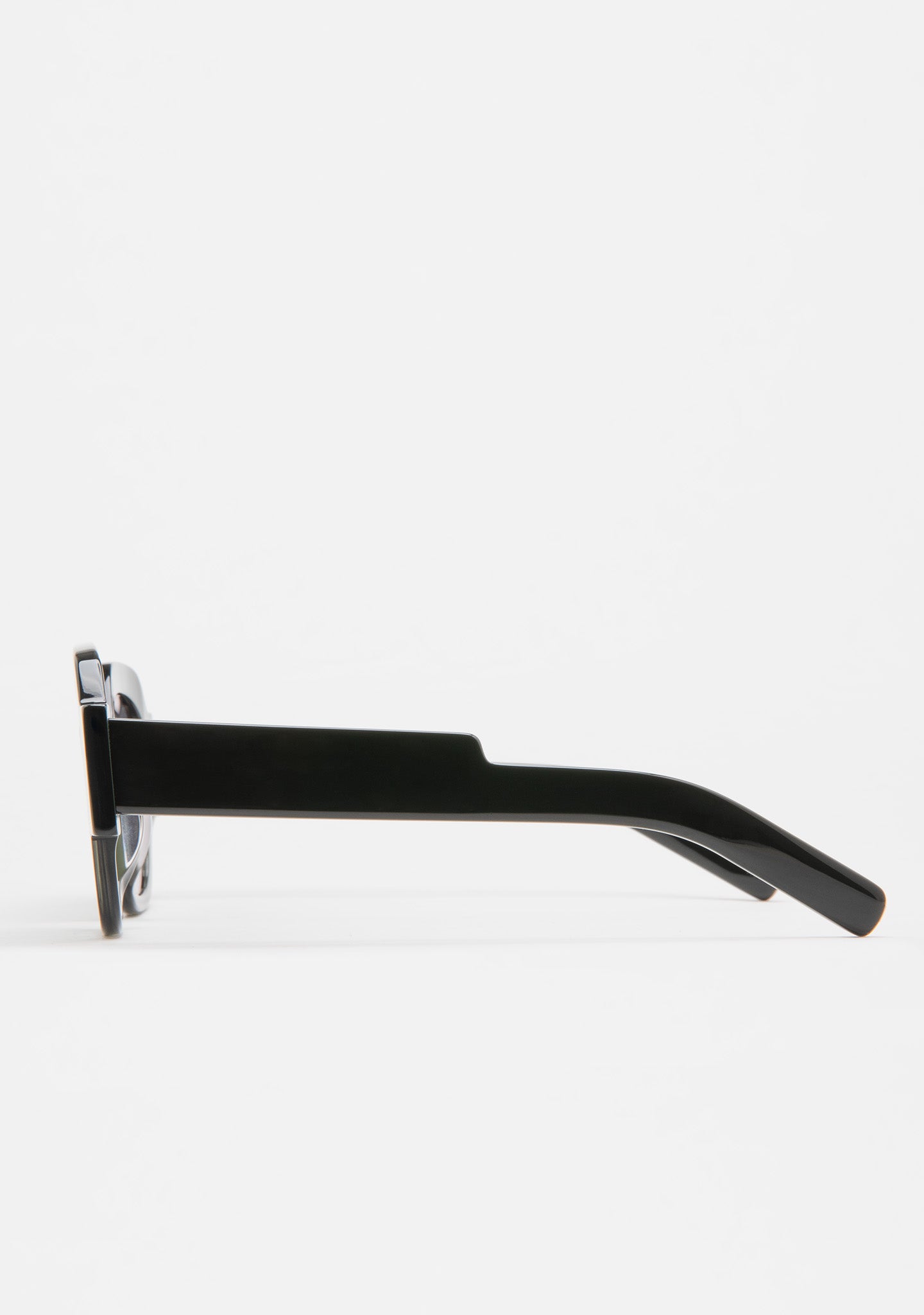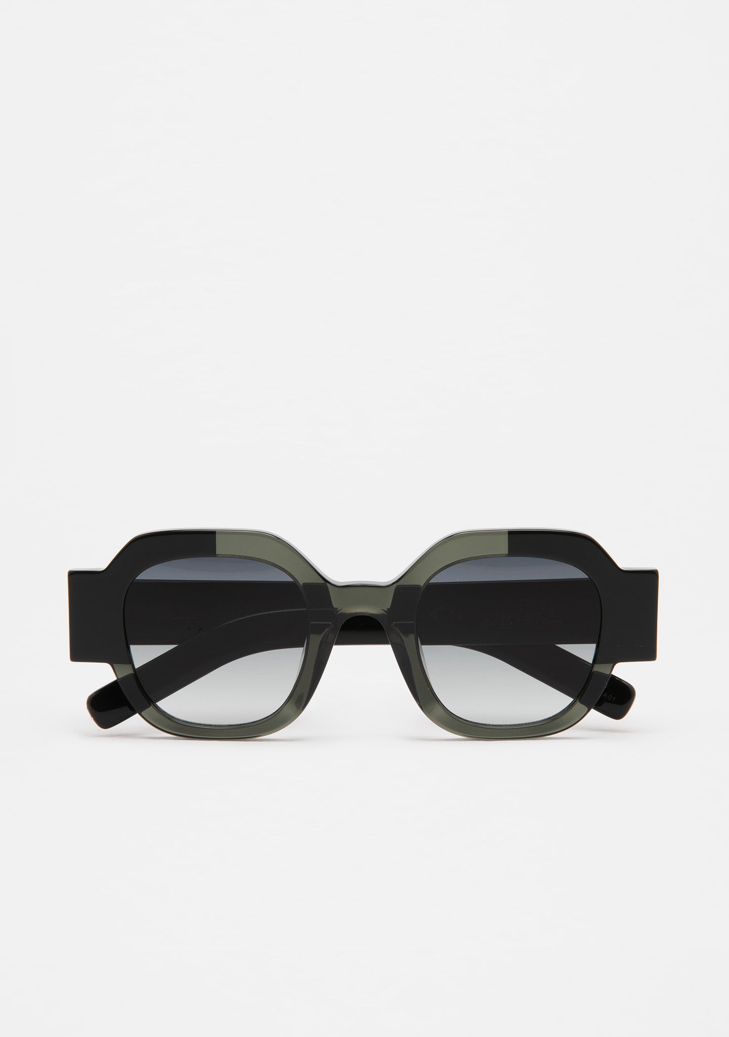 Gafa de sol de forma cuadrada. Frontal de acetato verde oscuro transparente con laminado verde oscuro. Varillas de acetato verde oscuro con un diseño que destaca por el escalón. Lente verde degradada base 2. Lente Categoría 2. Plaquetas de acetato incorporadas. Hecha a mano.