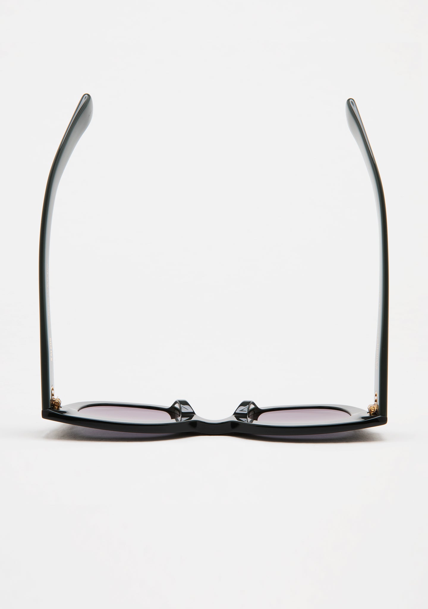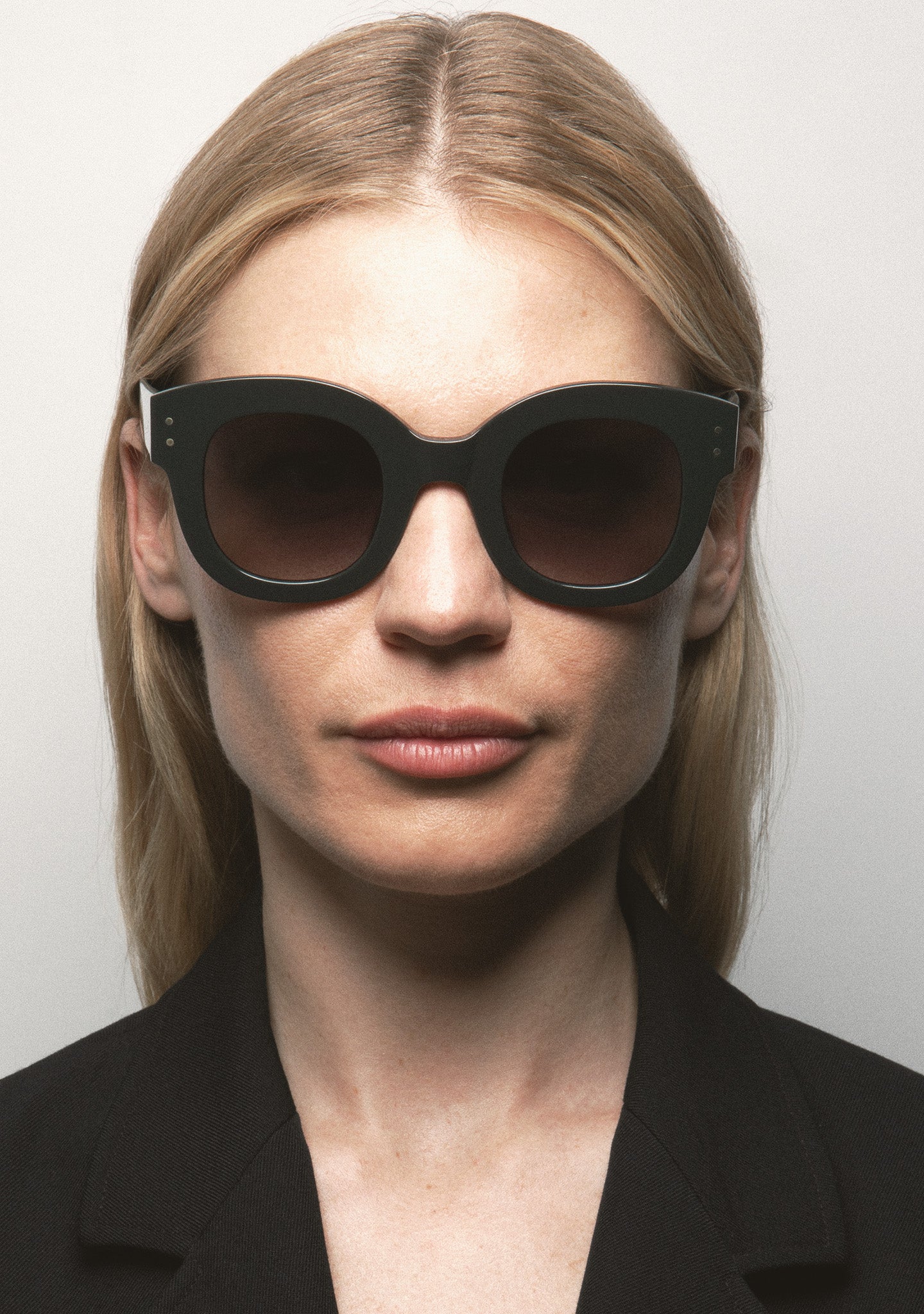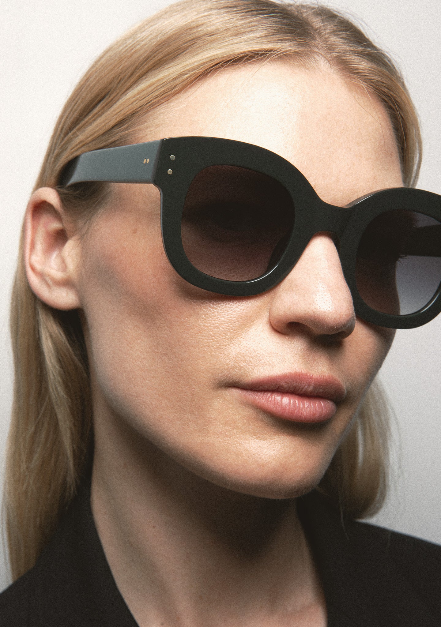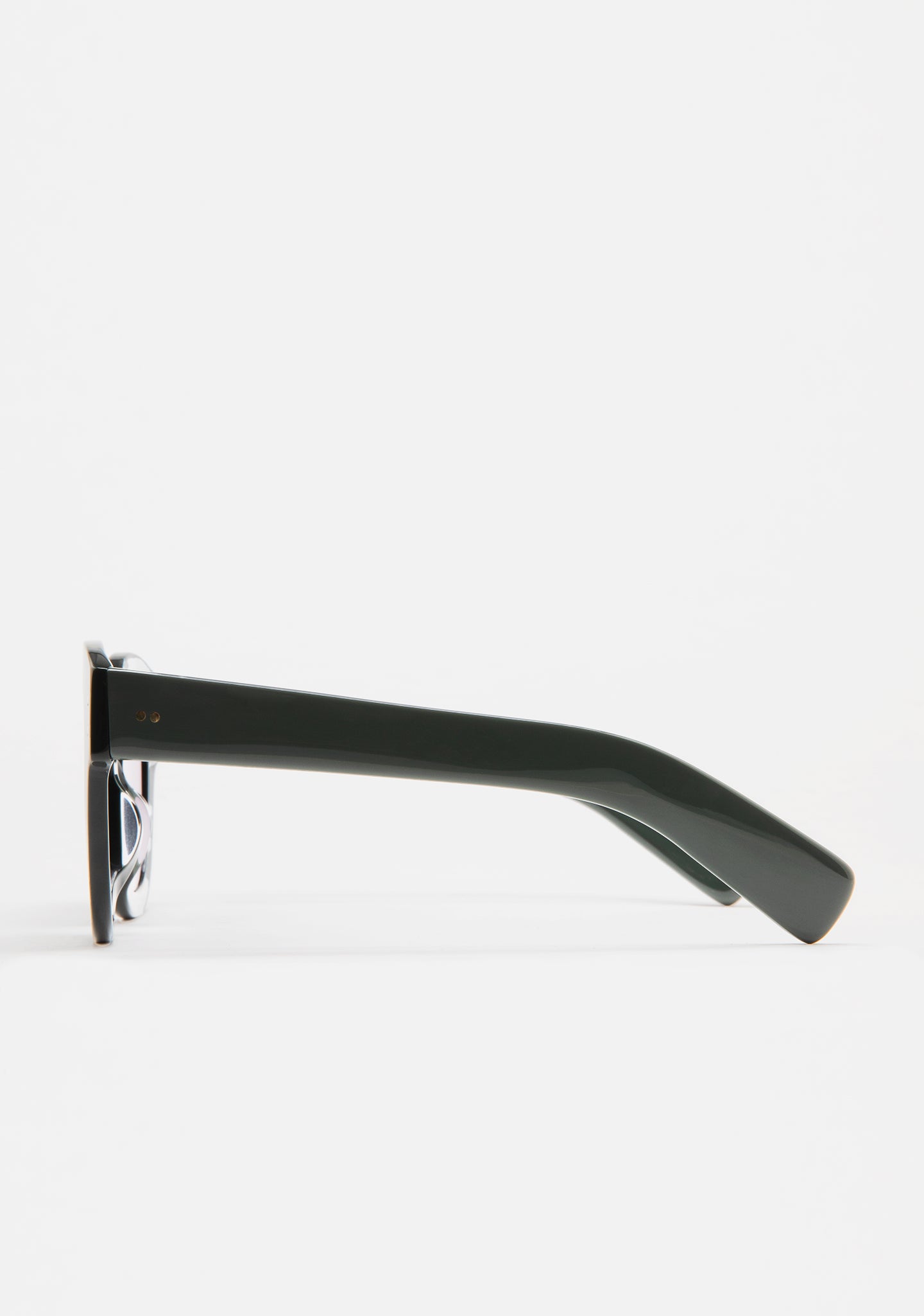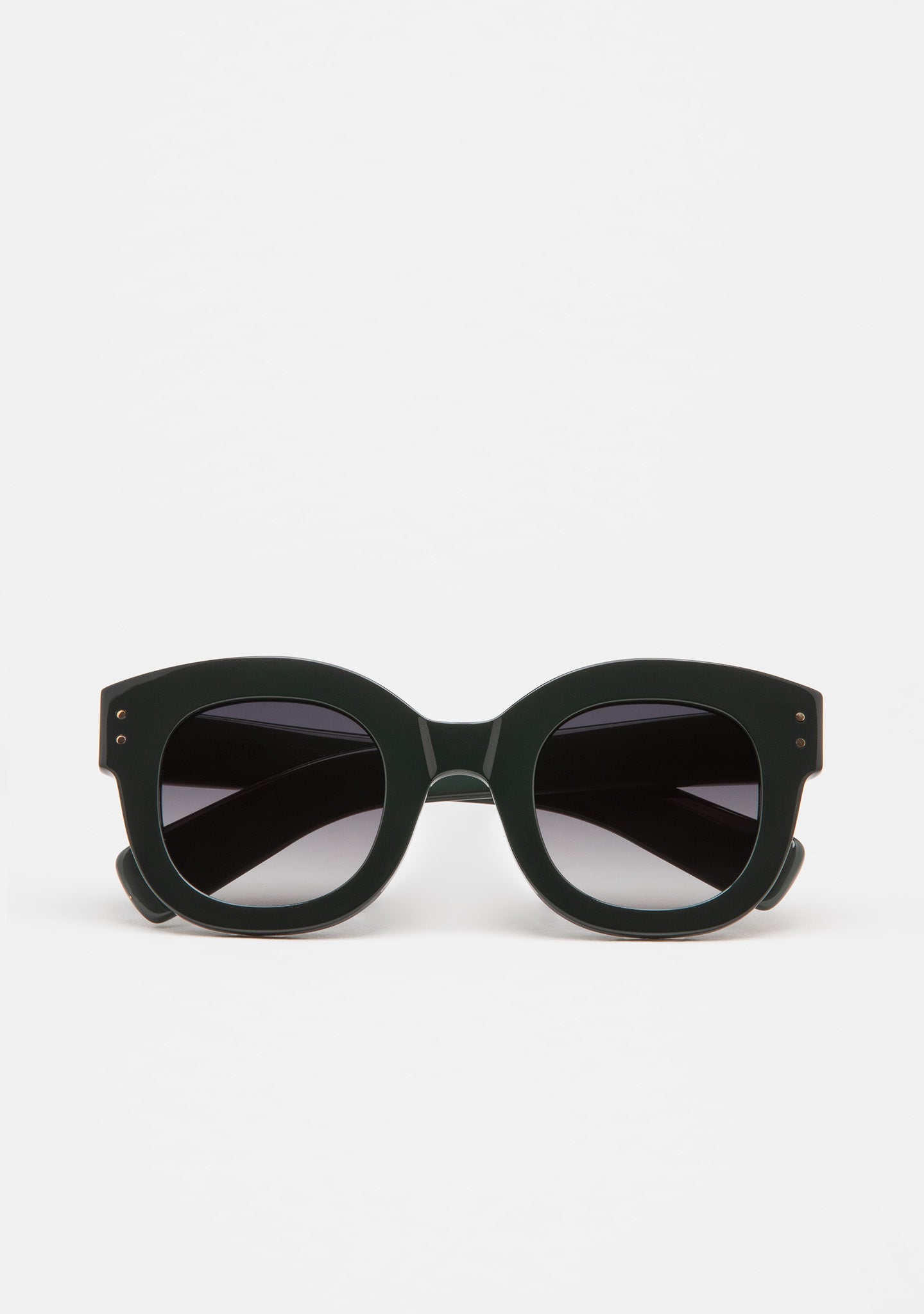 Gafa de sol de forma redondeada. Frontal y varillas de acetato verde oscuro. Lente gris degradada base 2 con 100% protección UV y tratamiento antirreflejante. Lente Categoría 3. Bisagras con remaches oro en codo y varillas. Plaquetas de acetato incorporadas. Hecha a mano.
